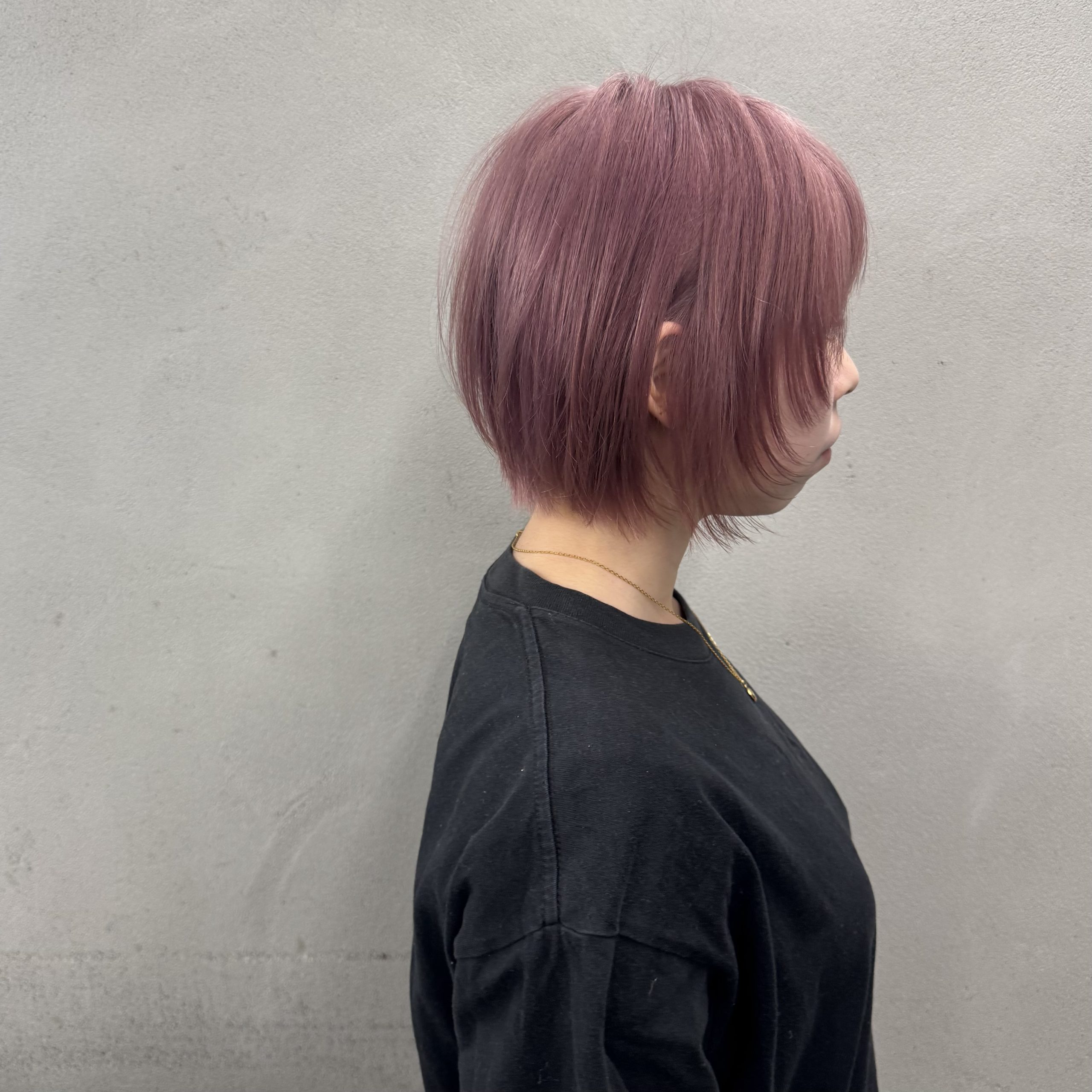 春らしいピンクカラーにショートスタイルは顔まわりにレイヤーで軽さをプラス